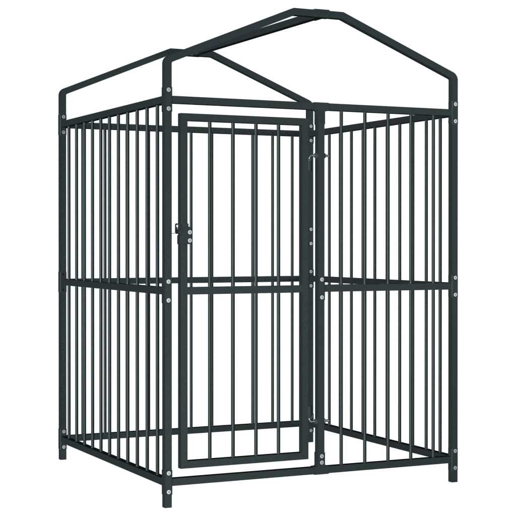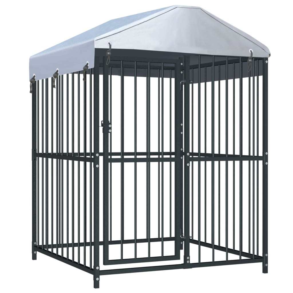 This large dog kennel provides ample exercise space while the steel bar walls help prevent mischief and unexpected accidents while enabling ventilation. Thanks to the sturdy and heavy-duty steel construction, this dog kennel is durable and built to last. The included fire-resistant and UV protected roof is made of 100% polyethylene and protects from the sun, rain, snow, and other harsh weather conditions. The hinged door has a lockable latch system which ensures extra security and safety for your dogs.