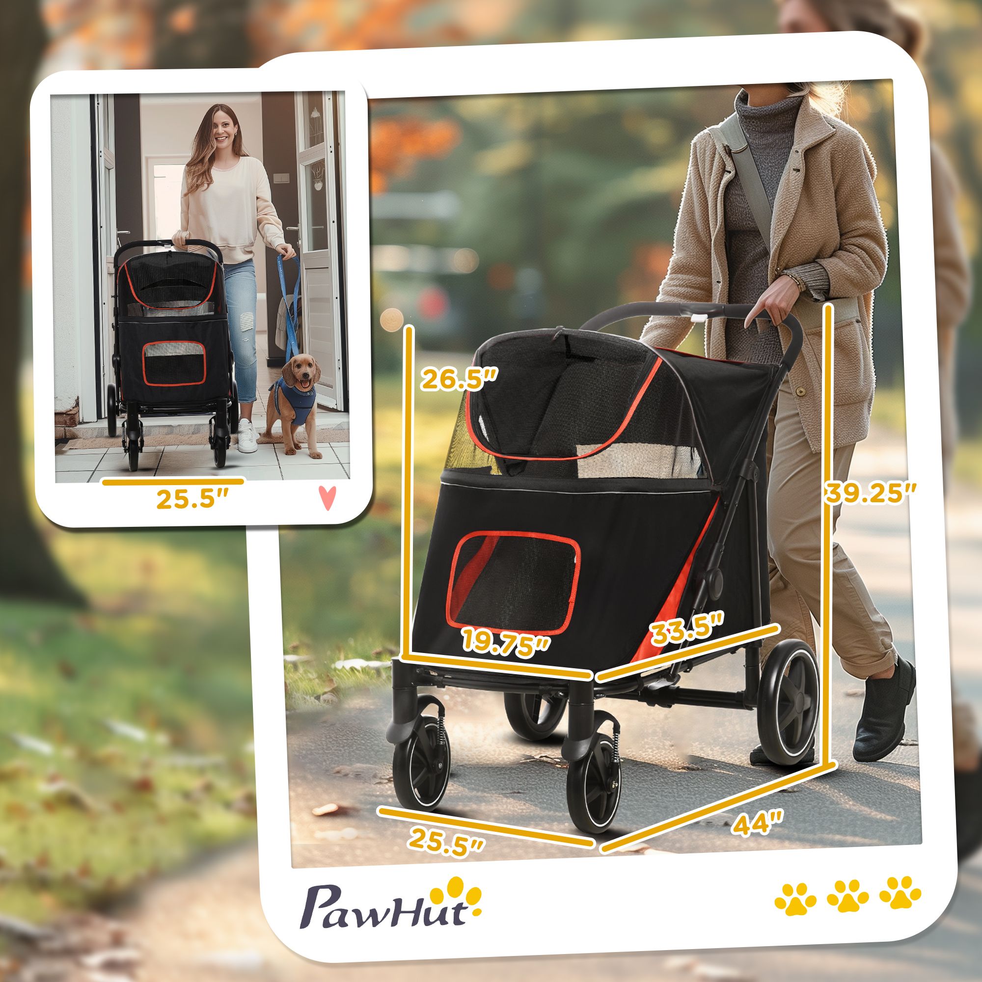 5.- Large Pet Stroller Info: Overall Dimensions: 44" L x 25.5" W x 39.25" H. Suitable for Large & Medium-Sized Dogs Less than 23.5" in Length and Less than 66 lbs. in Weight.
